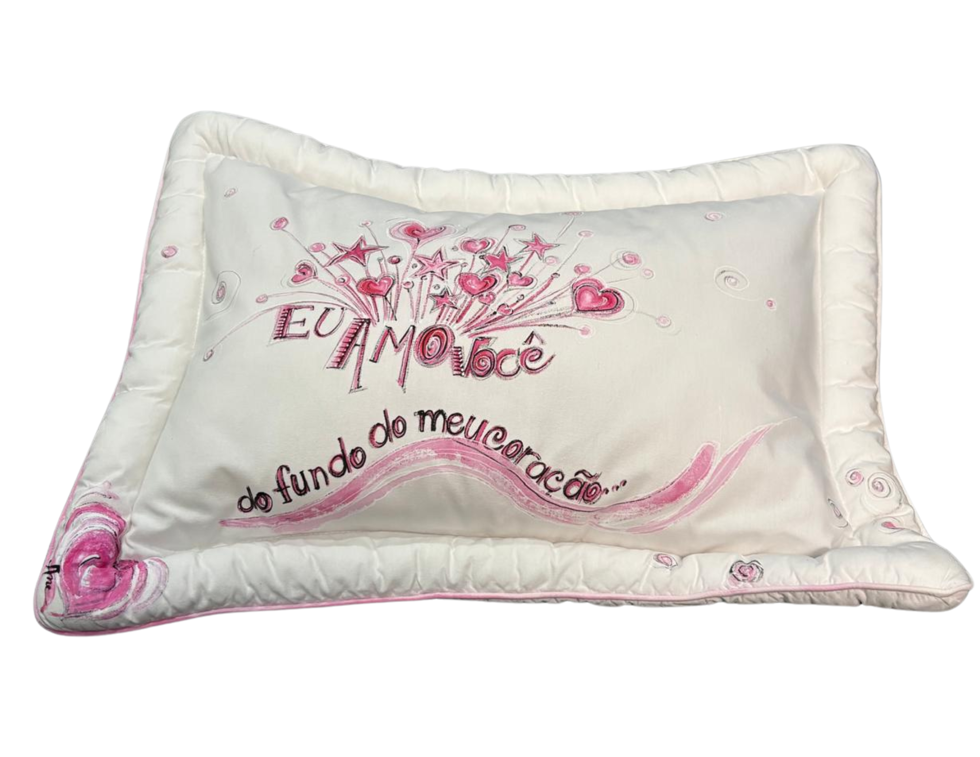 Com tecido percal de 180 fios, o travesseiro Amo Você oferece conforto e resistência para o uso diário. Sua pintura é totalmente artesanal, feita à mão pela artista Eliane de Pacheco Palácios, utilizando tinta lavável que preserva as cores mesmo após várias lavagens. O produto é lavável à máquina, facilitando a limpeza e manutenção, ideal para ambientes que exigem praticidade e cuidado como o quarto do bebê.