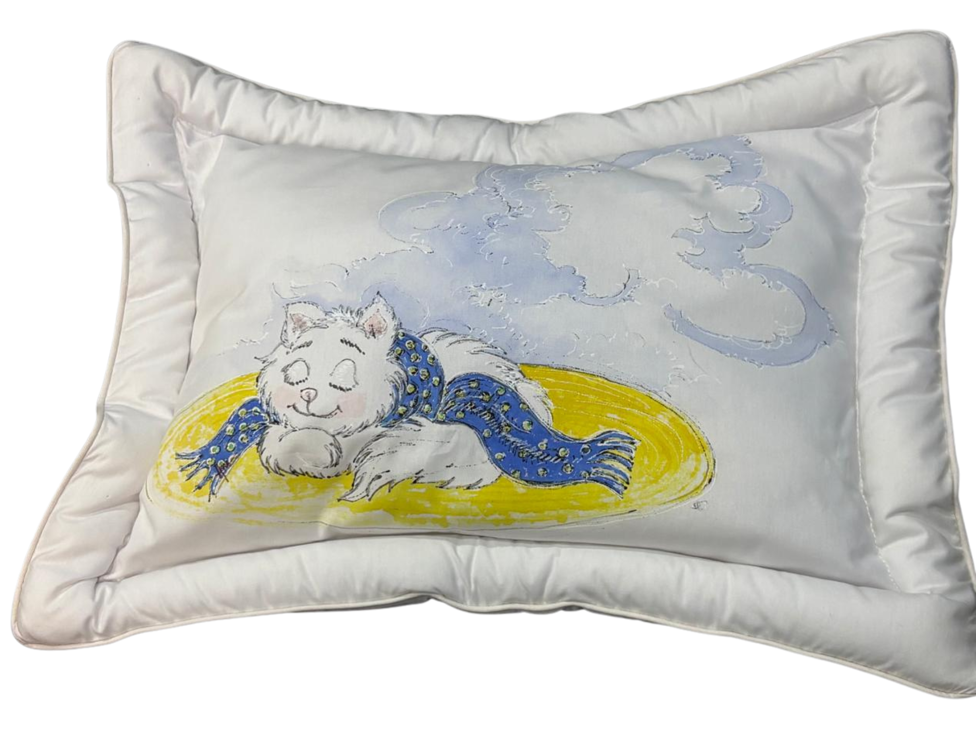 Use o travesseiro para decorar e proteger o bebê na hora do sono, facilitando a higiene com lavagem prática na máquina. Evite uso de alvejantes para preservar a pintura artesanal.